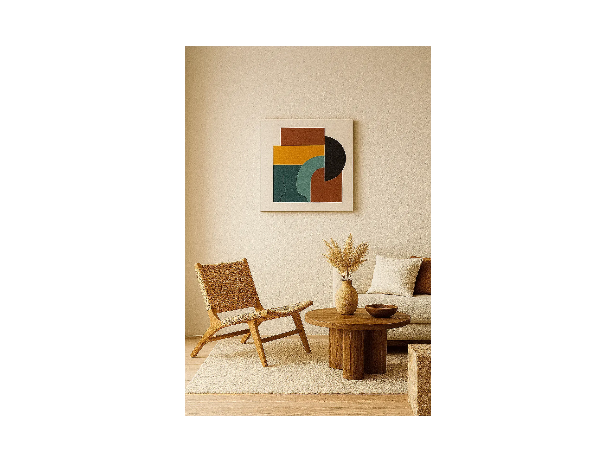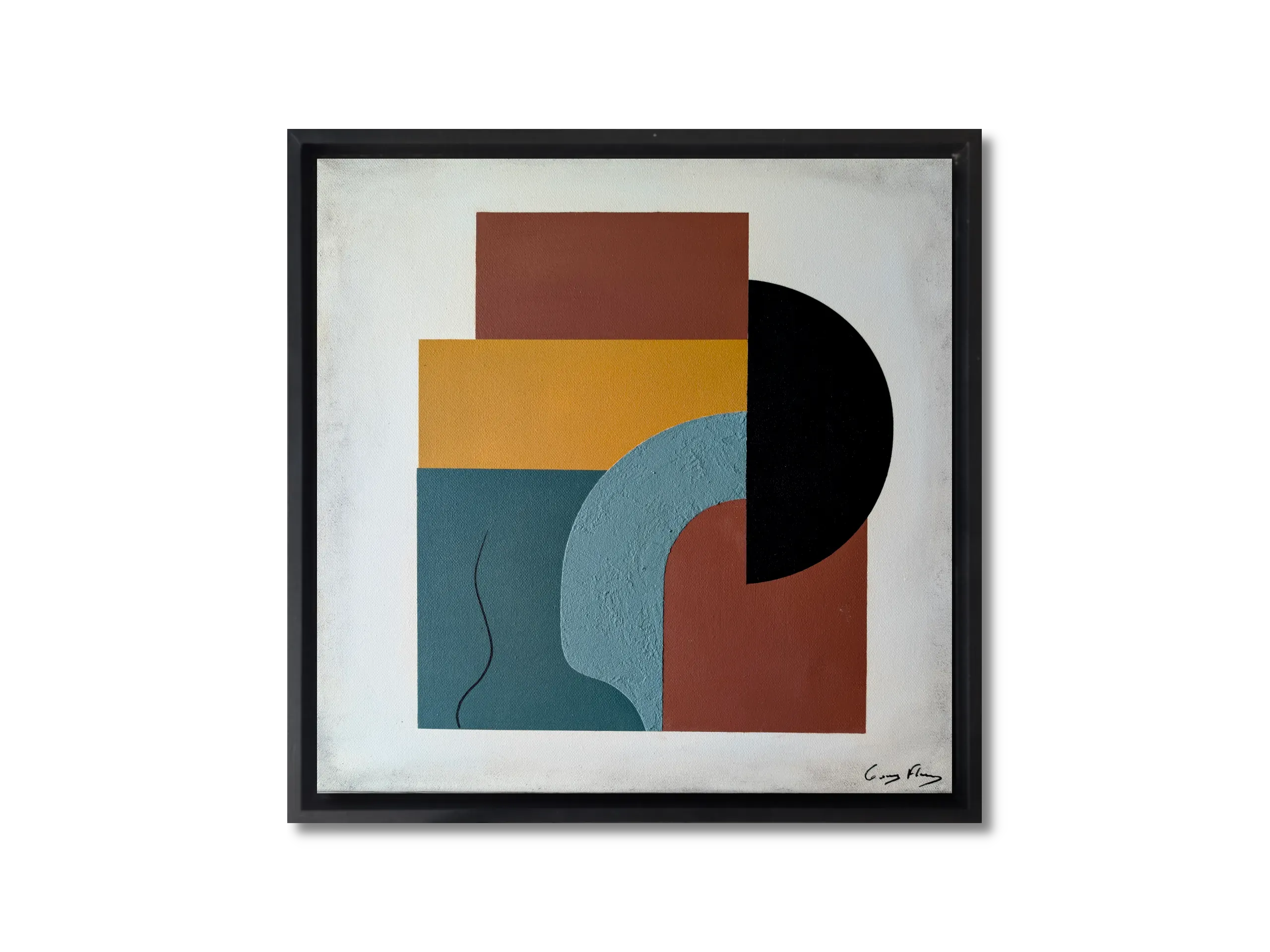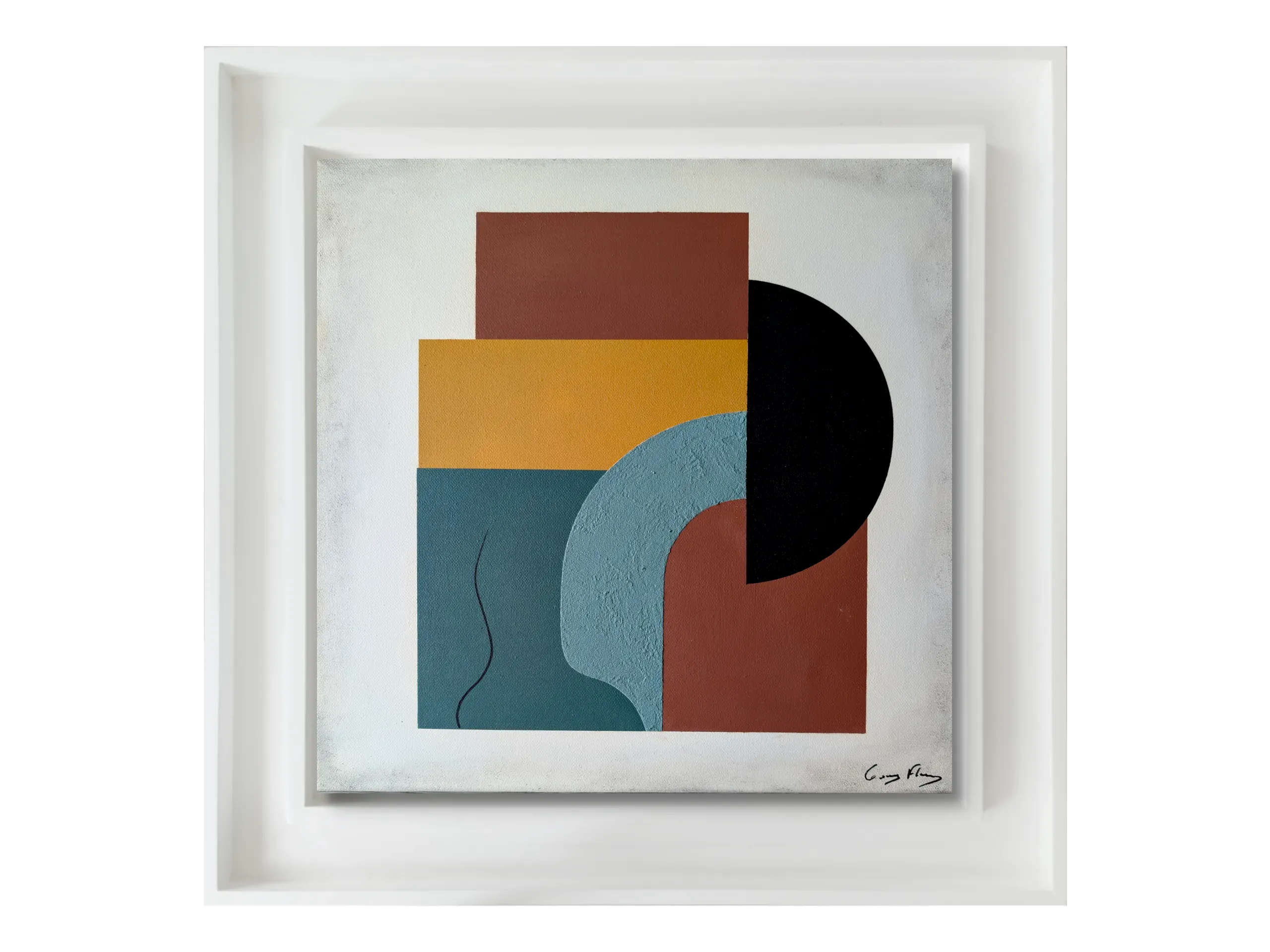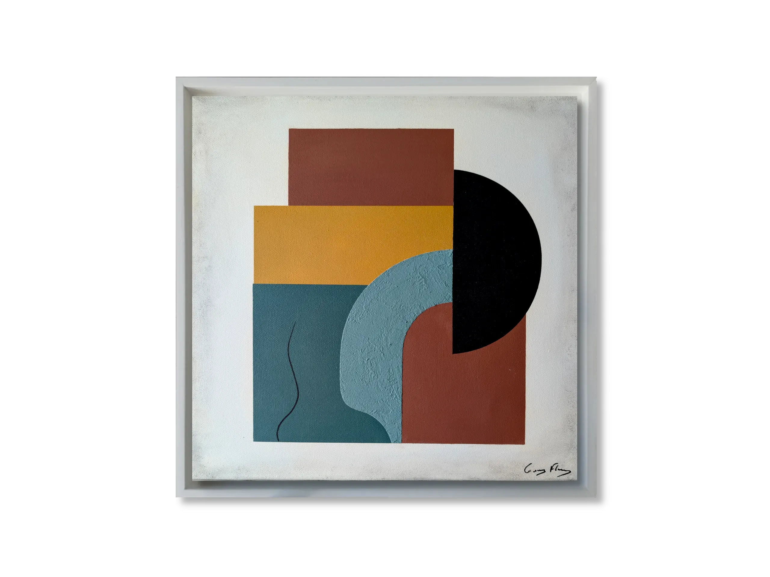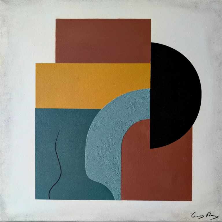 Cette œuvre se déploie comme une stratification de formes géométriques — rectangles, arcs et courbes — qui s’imbriquent dans une construction silencieuse. Les teintes rappellent la terre et les minéraux, tandis que le sable intégré à l’acrylique confère une texture vibrante, évoquant la densité du sol et la rugosité des surfaces. Une fine ligne ondulée noire traverse la zone bleue telle une fissure ou une veine, introduisant une respiration organique au sein de cette architecture minérale.