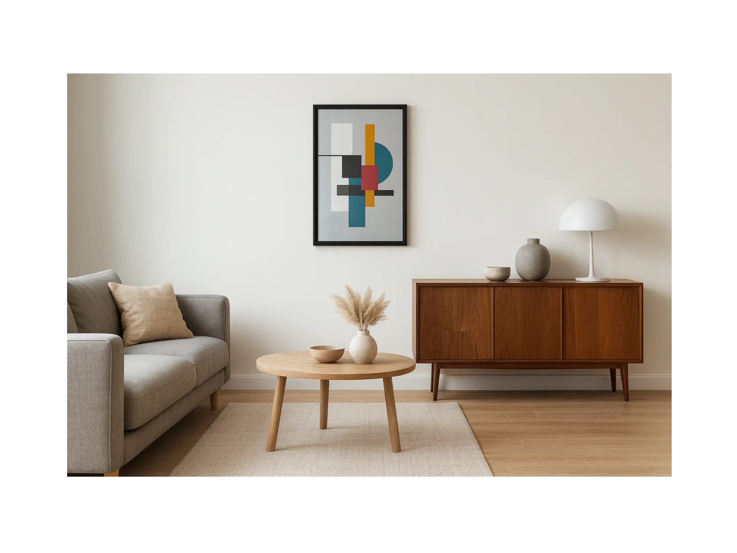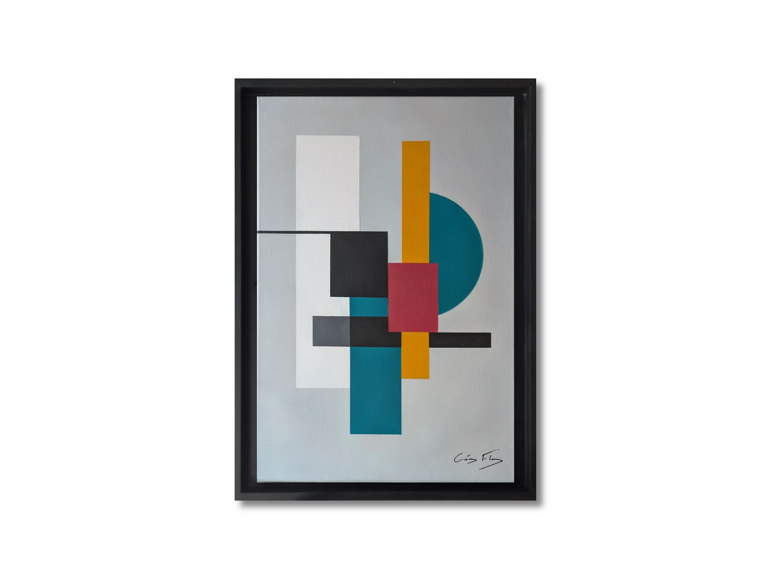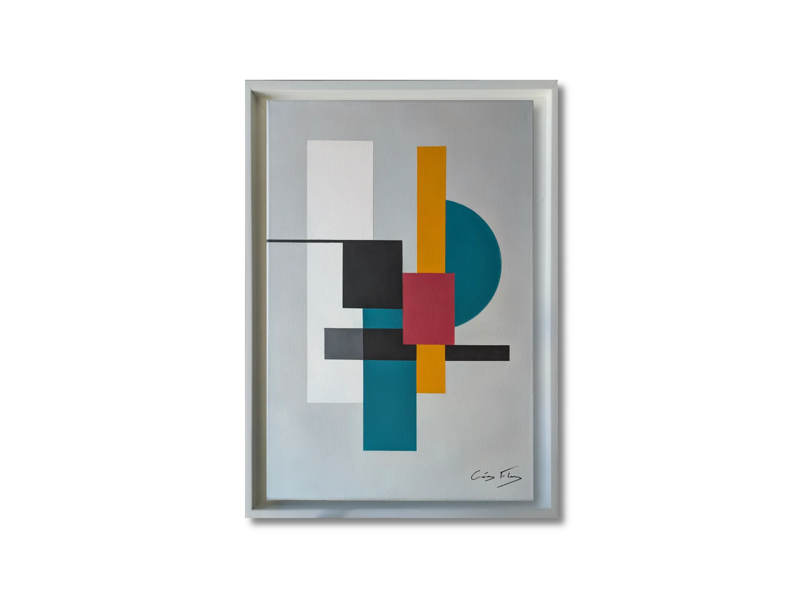Un tableau où les polygones se détachent du sol, comme en apesanteur. La composition explore la tension entre rigueur géométrique et fragilité suspendue, jouant sur la confrontation des teintes — gris, rouge, jaune, noir, turquoise — pour créer une architecture flottante. Chaque forme devient pilier d’un édifice immatériel, une construction intérieure qui tient dans le silence.