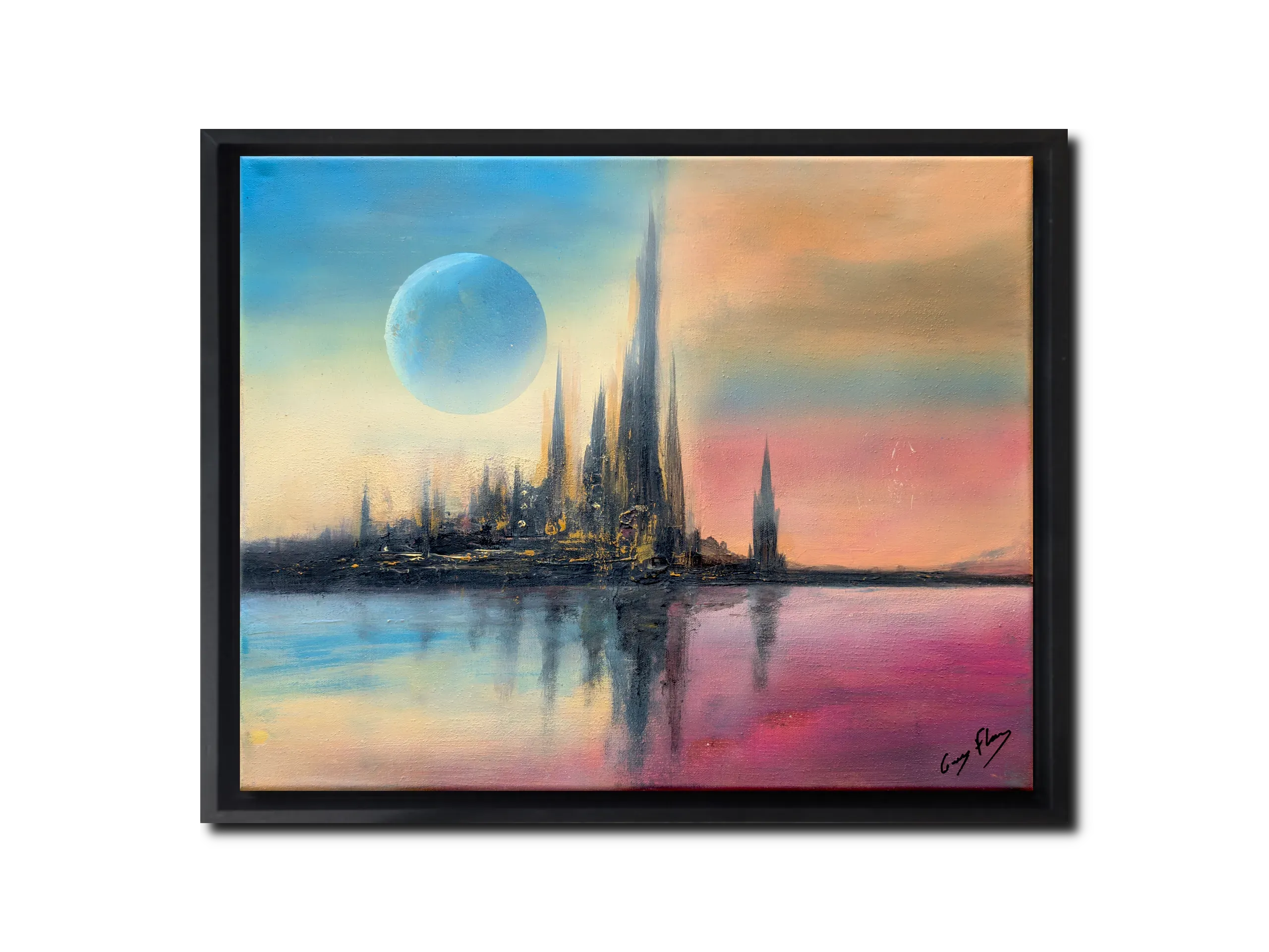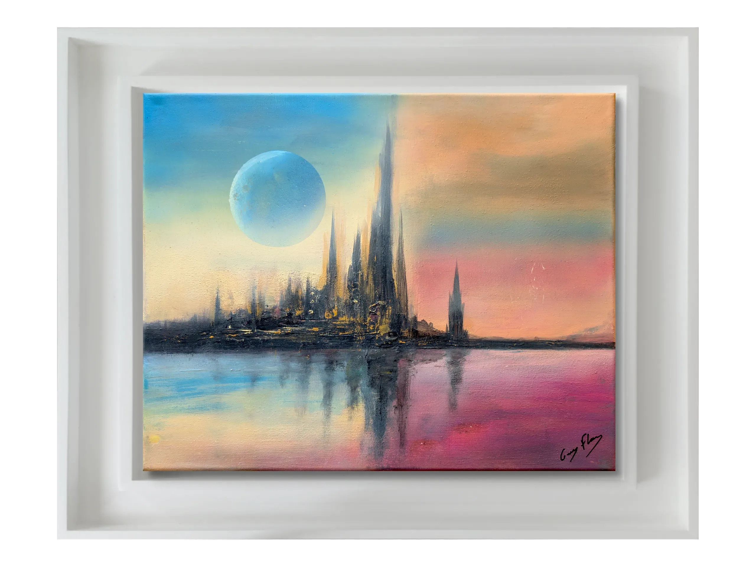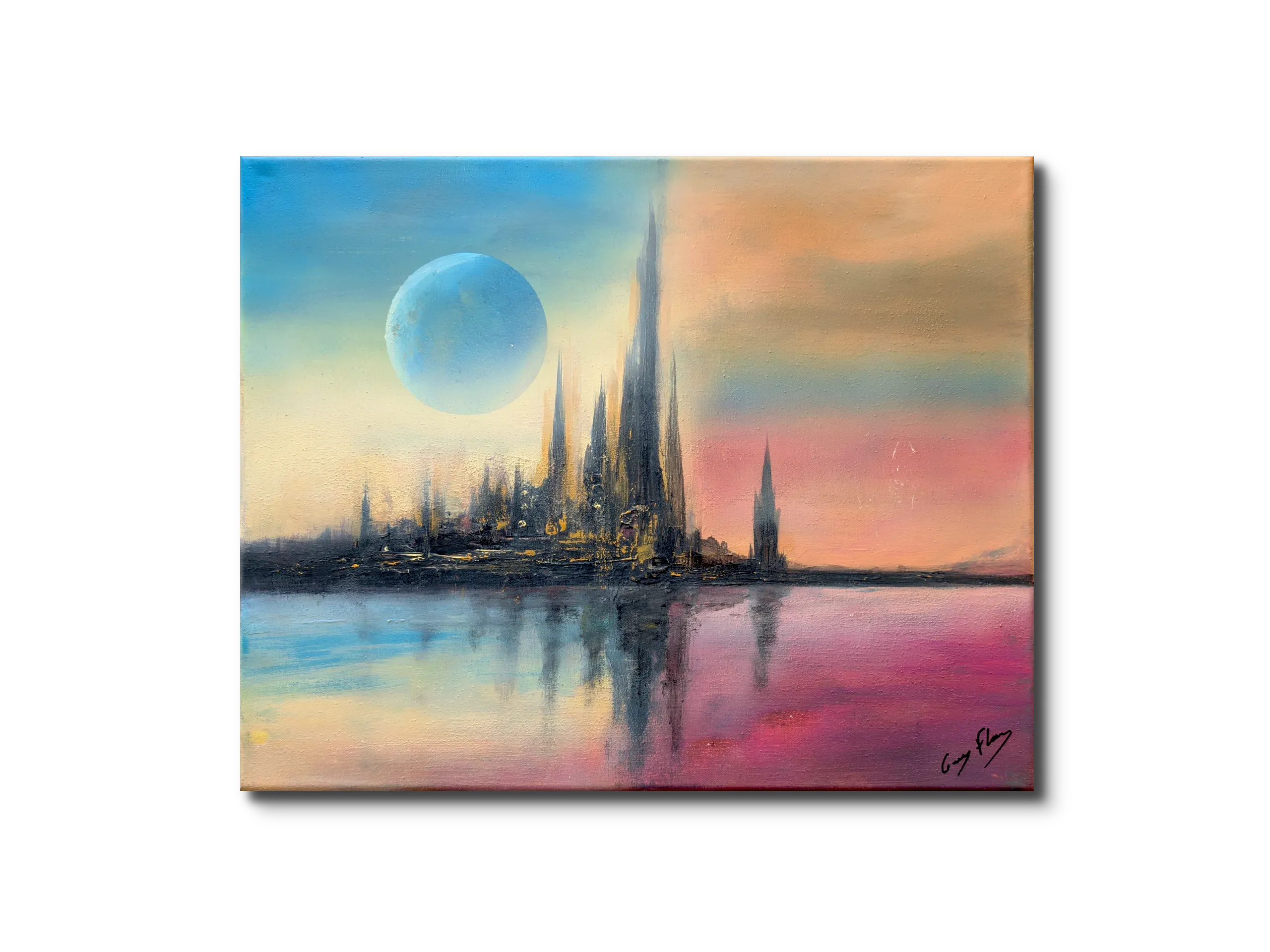 Une cité surgit comme un mirage, entre deux souffles de lumière. Les tours s’élancent vers l’infini, reflet d’un monde intérieur où le ciel se déchire en dualité : le froid bleu d’un astre lointain et la chaleur incandescente d’un horizon en feu. L’eau devient mémoire, miroir des possibles, et l’architecture se transforme en langage silencieux. Ici, l’espace n’est plus un lieu mais une vibration, une frontière fragile entre rêve et réalité.